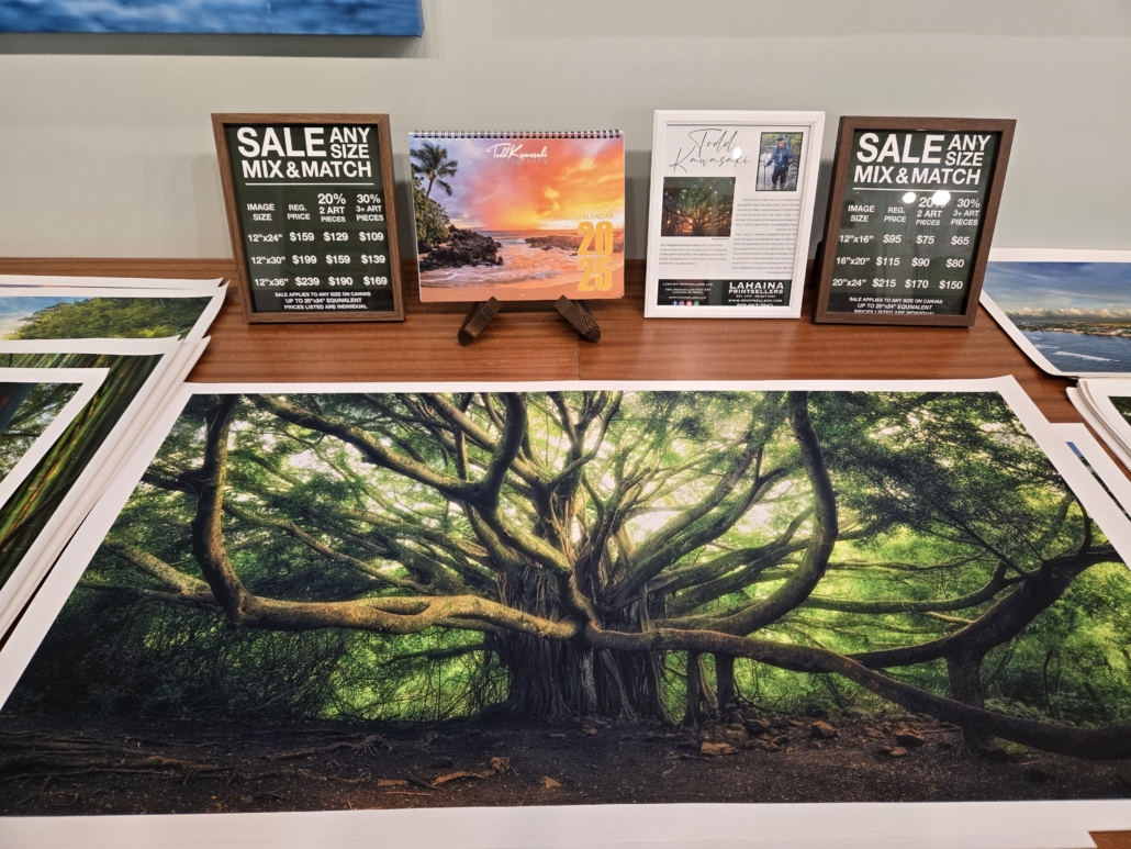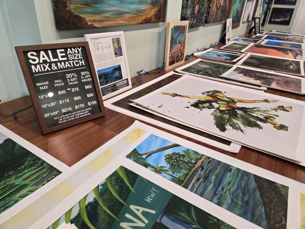 Lahaina Printsellers, est. 1978, represents local artists and photographers on Canvas Giclee's and Dye Infused Aluminum. Affordable local art for anyone. We provide in house Gallery Wraps and Framed Art for Local Clients. We can print any size on Canvas or Dye Infused Aluminum.